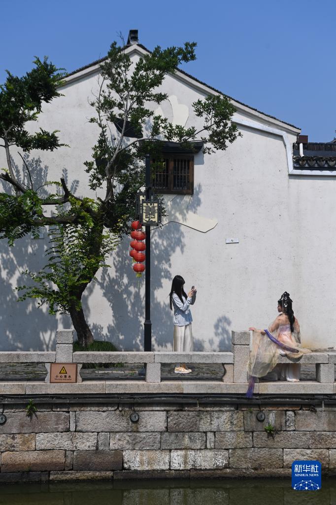 6月14日,身著傳統服飾的游客在織里鎮義皋古村落拍照留影。