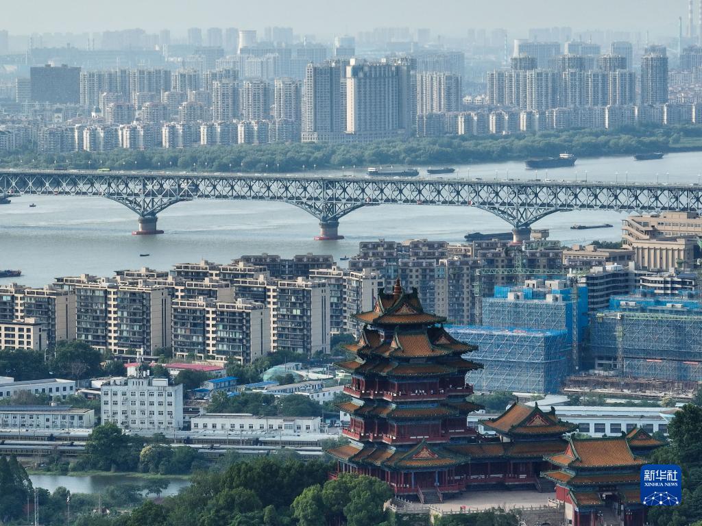 南京閱江樓與南京長江大橋(6月11日攝,無人機照片)。