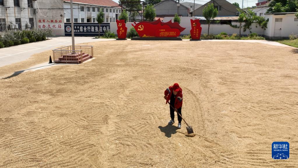 6月13日,村民在陽信縣金陽街道辦事處辦公樓前晾曬小麥(無人機照片)。