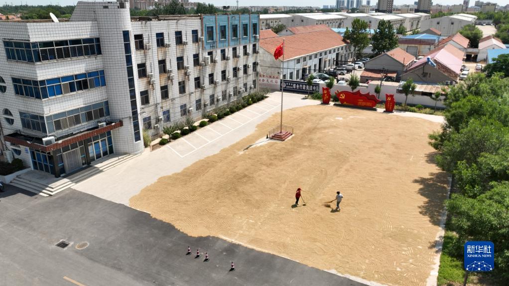 6月13日,村民在陽信縣金陽街道辦事處辦公樓前晾曬小麥(無人機照片)。