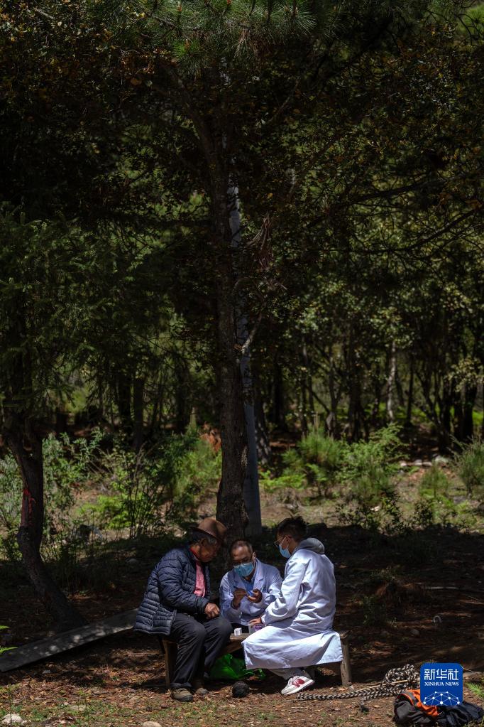 返程的途中,又有兩位老人攔住了汽車,他們得知當天送醫上門的消息,便等候在離村幾公里的地方。于是,在路邊的樹下,王振疆醫生又帶著尼瑪益西為兩位老人進行了診療。