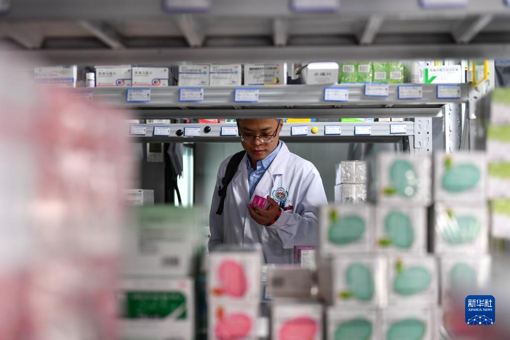 6月12日出發前,王振疆醫生在米林市人民醫院庫房領取藥品。