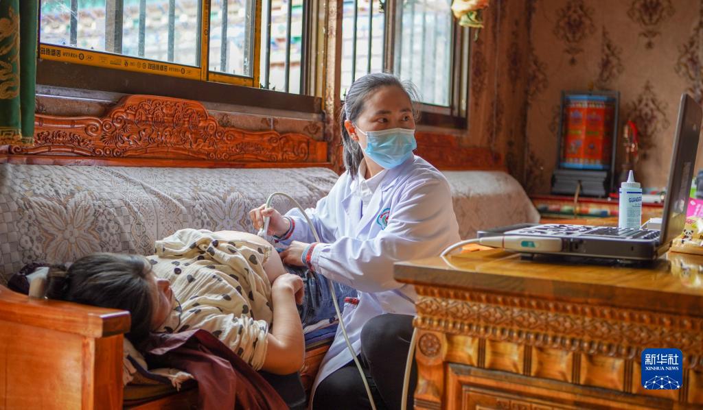 6月12日,陳冰醫生(右一)在給產婦扎西央宗做產檢。