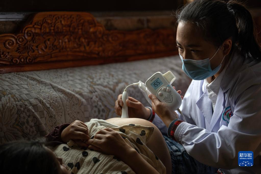 6月12日,陳冰(右)在為懷孕38周的扎西央宗進行產檢。