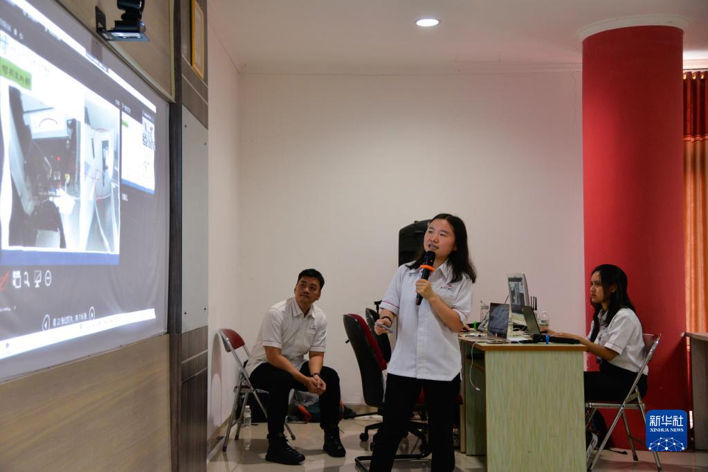 3月20日,在位于印度尼西亞茉莉芬市的印尼鐵路理工學院,中國員工劉淑媛(中)在雅萬高鐵首批運維人員培訓班上擔任翻譯。