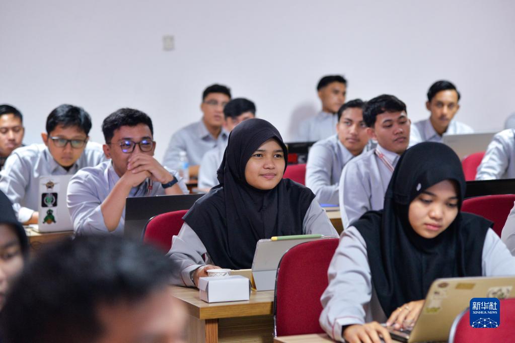 6月7日,在位于印度尼西亞茉莉芬市的印尼鐵路理工學院,應急值守人員培訓班學員尼斯麗娜(中)參加培訓。