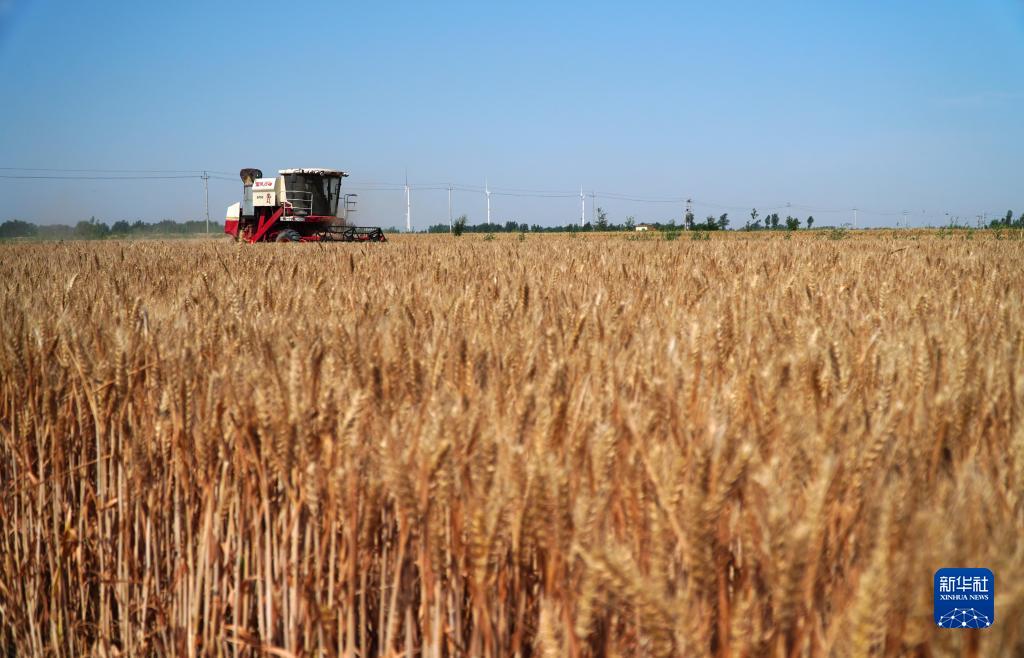 6月14日,在山東省臨邑縣林子鎮,聯合收割機在收獲小麥。