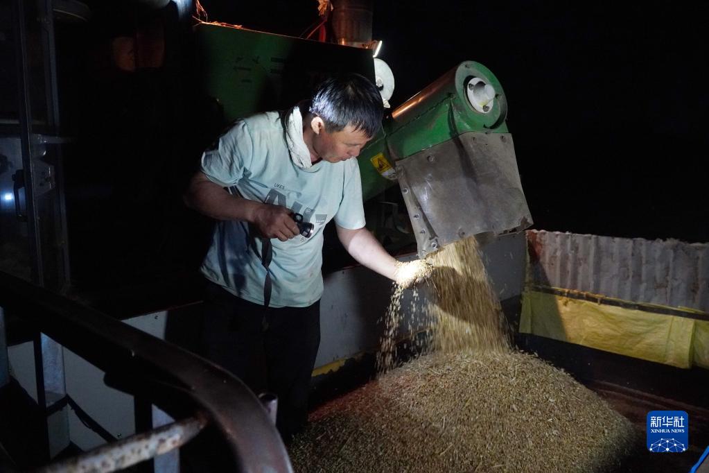 6月13日晚,在山東省臨邑縣臨盤街道,農戶在檢查收獲的麥子。
