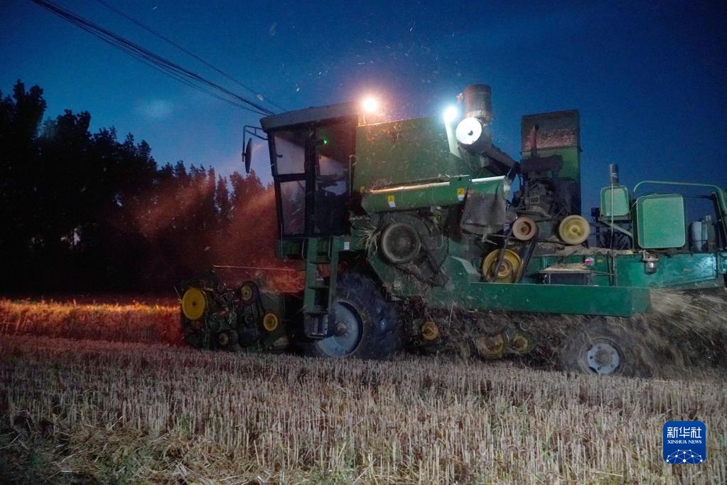 6月13日,在山東省臨邑縣臨盤街道,聯合收割機在夜間進行麥收作業。