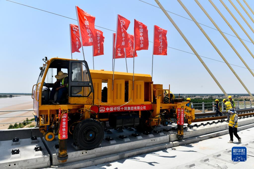 6月14日,在濟鄭高鐵山東段長清黃河特大橋,中鐵十局的工作人員進行鐵軌鋪設作業。