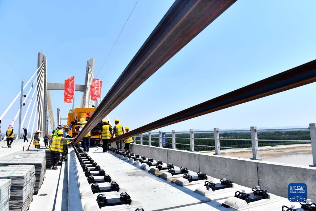 6月14日,在濟鄭高鐵山東段長清黃河特大橋,中鐵十局的工作人員進行鐵軌鋪設作業。