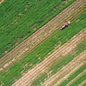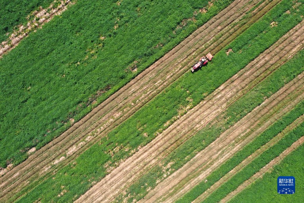 6月14日,在河北省滄州市吳橋縣安陵鎮,農民駕駛農機對馬鈴薯進行殺秧(無人機照片)。