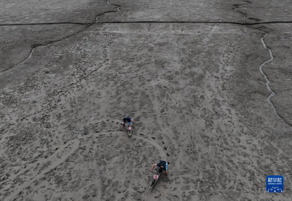 6月14日,游客在蛇蟠島的一片灘涂上體驗滑泥項目(無人機照片)。