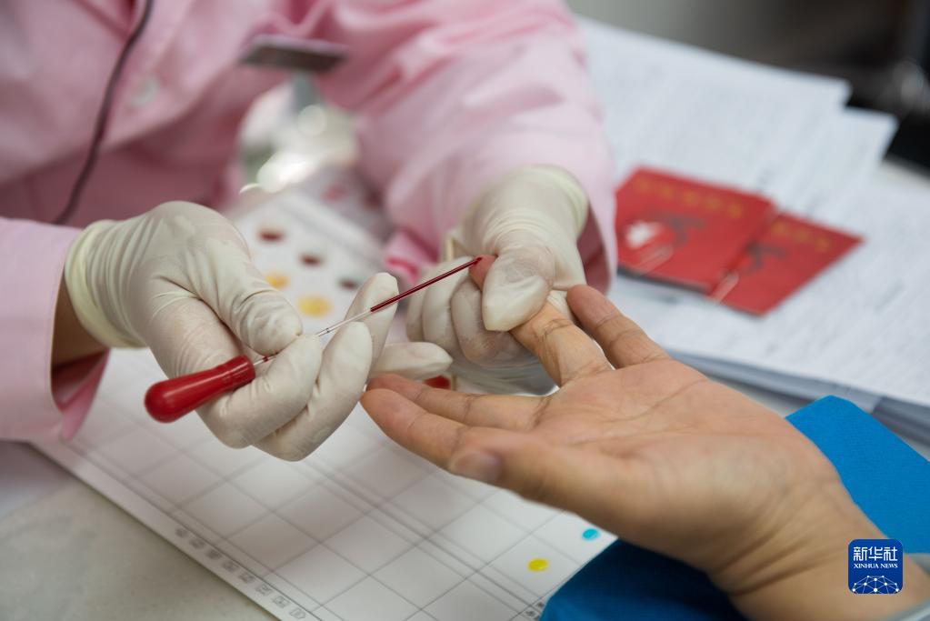 6月14日,在寧夏銀川市新華街愛心獻血車內,醫務人員為獻血者進行血樣檢測。