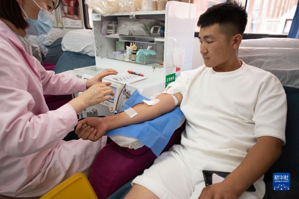 6月14日,市民在寧夏銀川市新華街愛心獻血車內獻血。