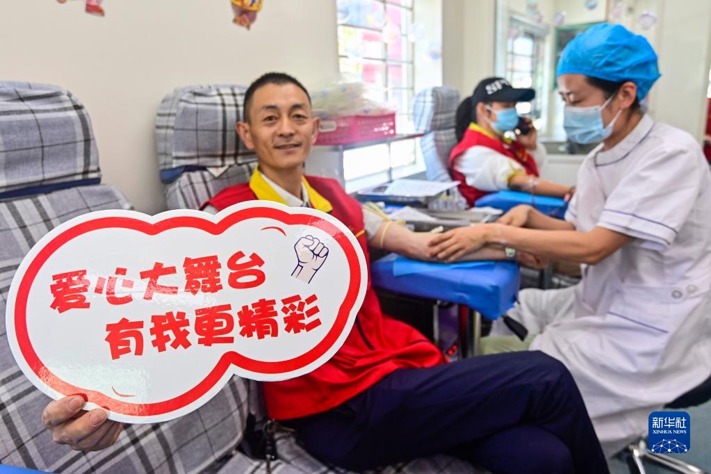 6月14日,山東省青州市志愿者在街頭一處獻血屋參與無償獻血。
