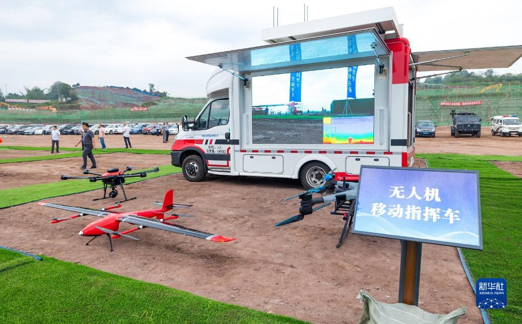 這是演練現場展示的無人機移動指揮車(6月14日攝)。