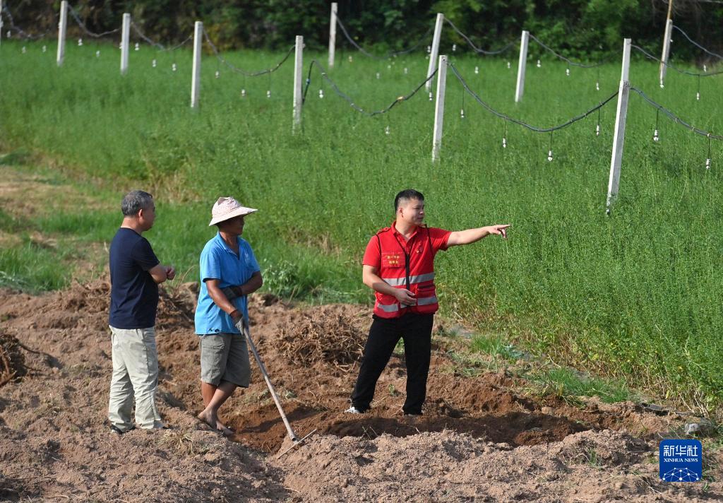 6月14日,在鹿寨縣鹿寨鎮窯上村,駐村第一書記榮雙全(右一)在蔬菜基地查看產業發展情況。