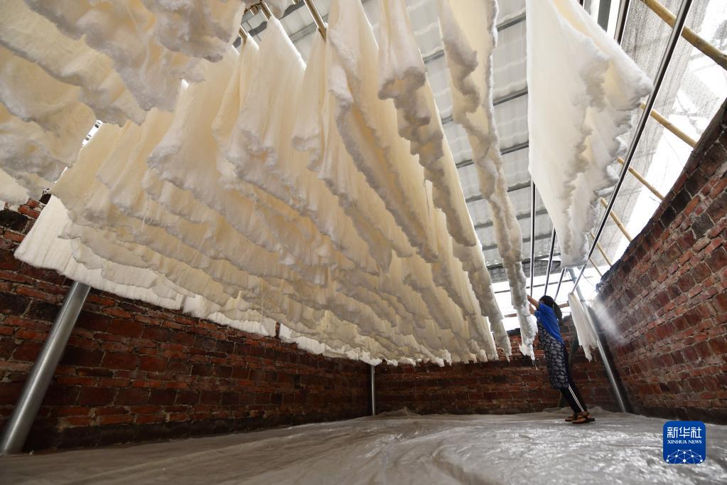 6月14日,在鹿寨縣黃冕鎮山腳村蠶絲被加工廠,村民在曬絲。