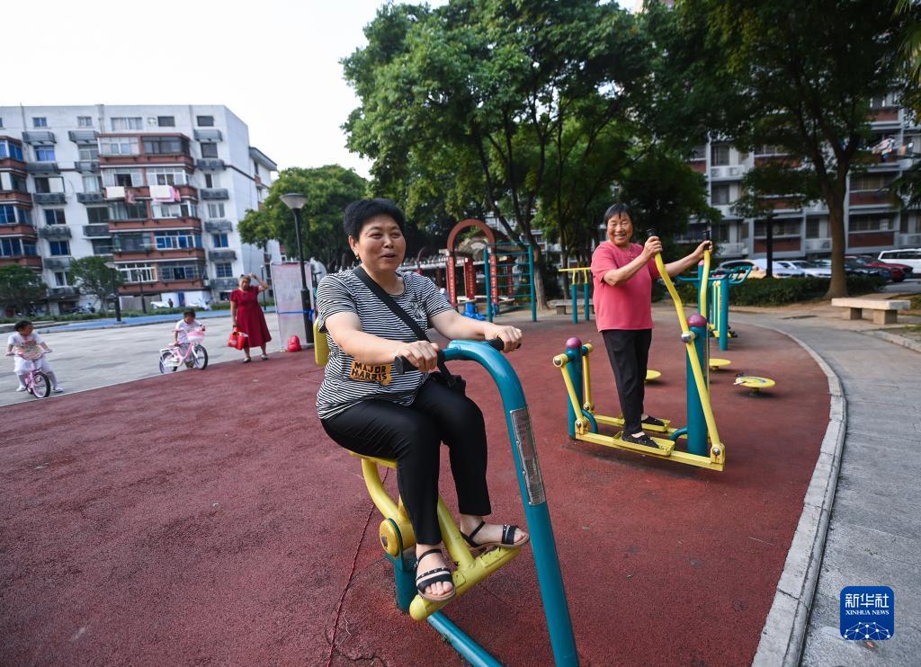 6月14日,在嘉興市南湖區新嘉街道電子社區內,老人們在進行器械鍛煉。