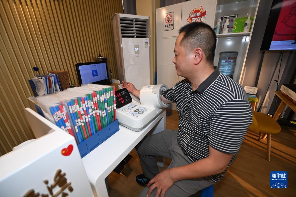 6月14日,在嘉興市南湖區新嘉街道電子社區鄰里中心的長者運動健康之家內,居民在測量血壓。
