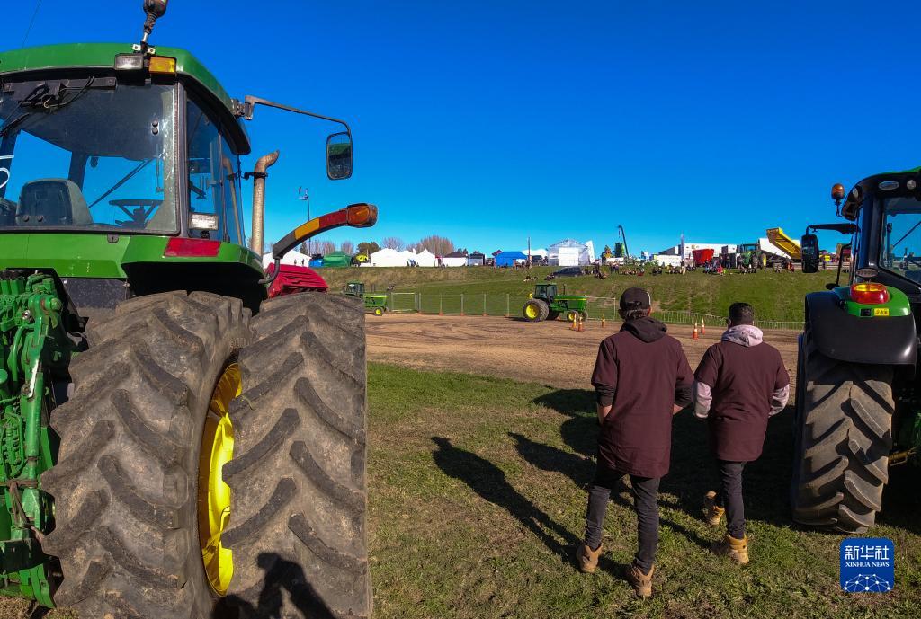 6月14日,在新西蘭漢密爾頓舉行的國際農業博覽會上,人們走過大型農用機械。新華社記者 郭磊 攝