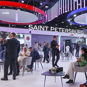 這是6月14日在俄羅斯圣彼得堡國際經濟論壇上拍攝的圣彼得堡地區展臺。