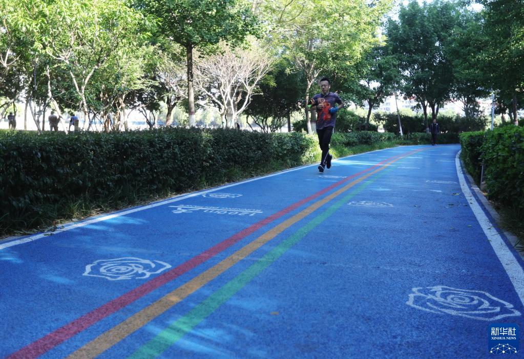 6月3日,市民在秦皇島市海港區綠廊綠道——健步主題公園內的可透水路面上跑步。