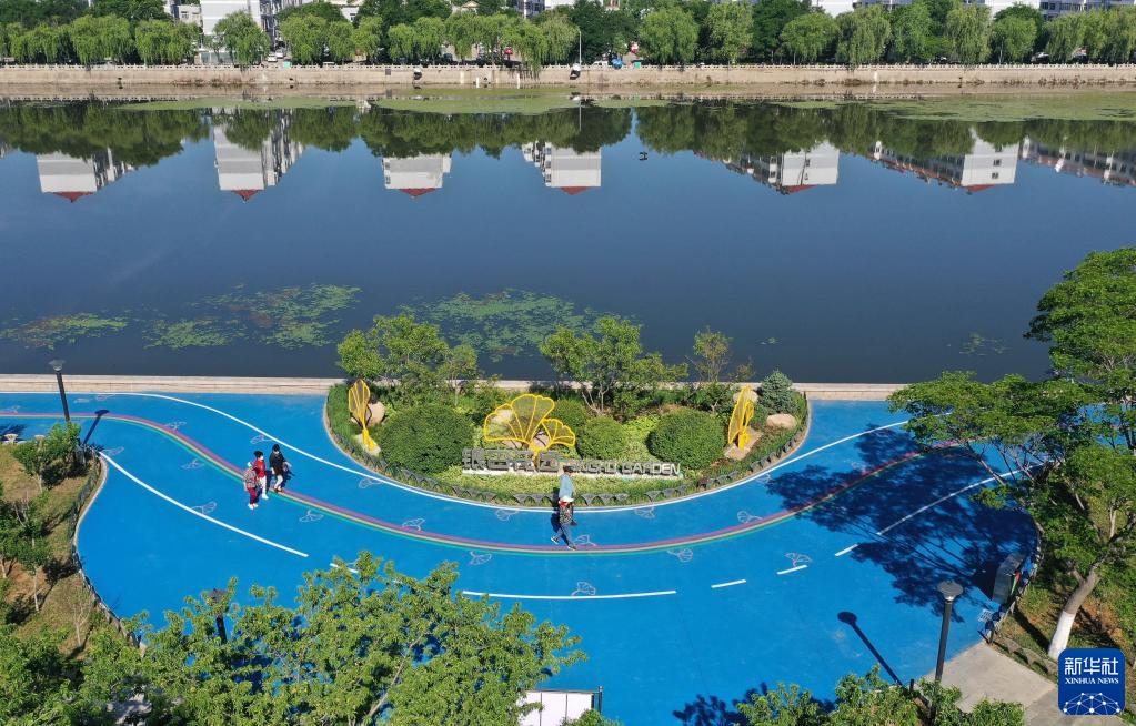 6月3日,市民從秦皇島市海港區綠廊綠道——健步主題公園內的可透水路面上走過(無人機照片)。