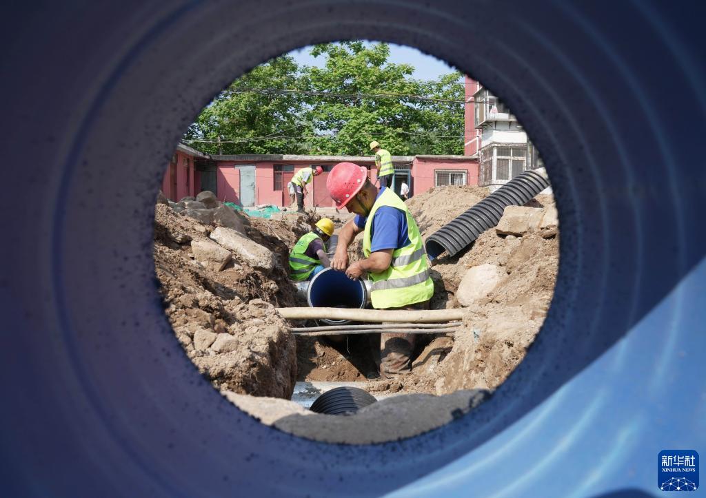 6月14日,工人在秦皇島市海港區一老舊小區改造工地施工。