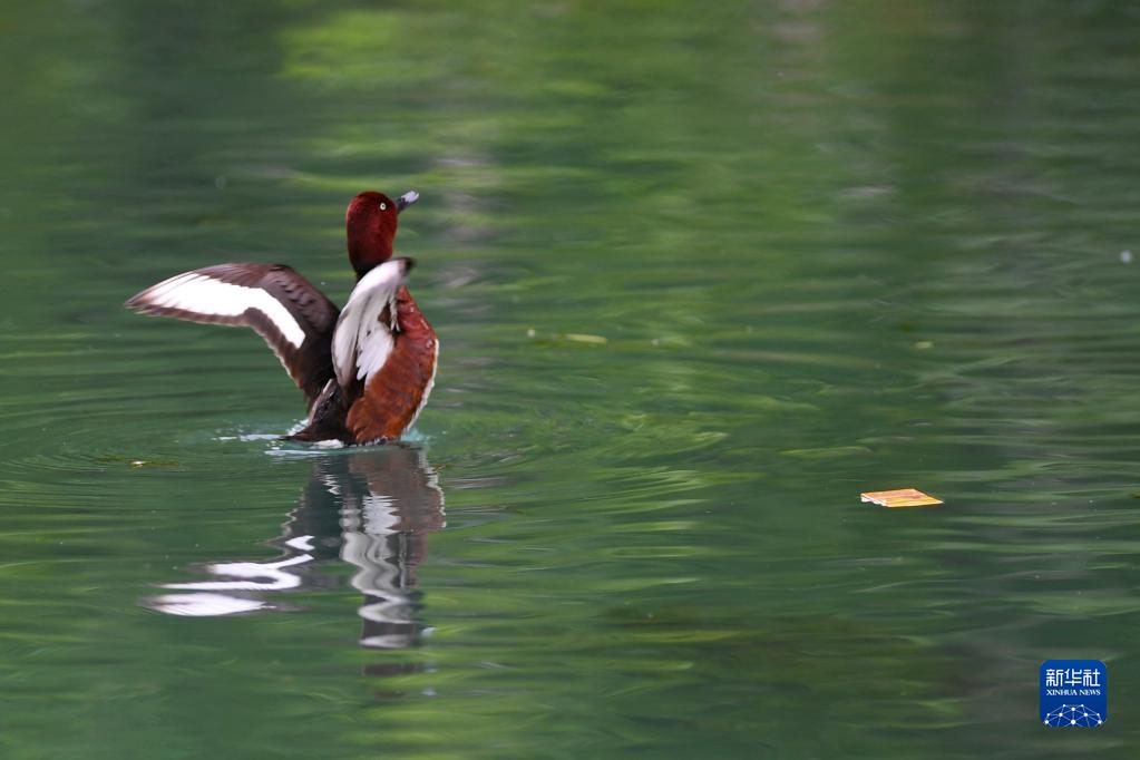 夏日里,白眼潛鴨和鳳頭潛鴨在西藏拉薩市拉魯濕地國家級自然保護區中干渠里覓食、嬉戲。