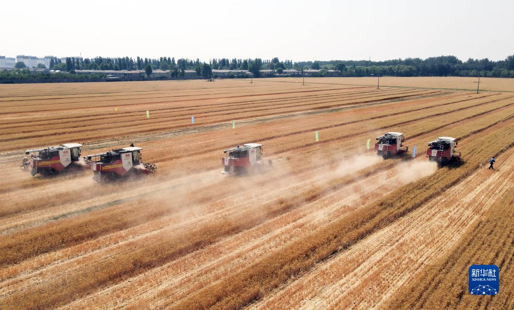 6月15日拍攝的2023年北京市小麥機收減損技能大比武現場(無人機照片)。