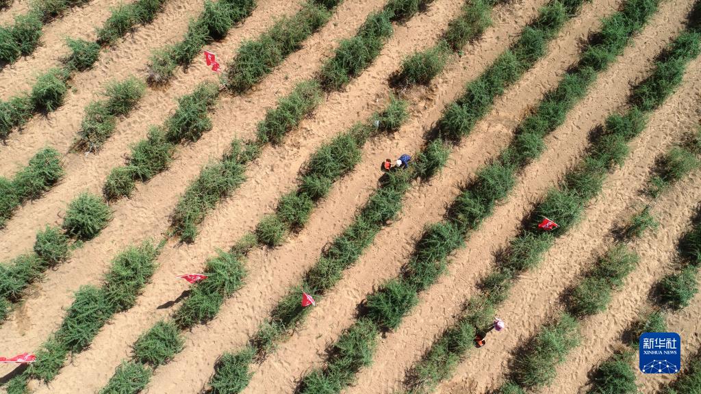 6月15日,采摘工在寧夏吳忠市紅寺堡區百瑞源枸杞種植基地采摘枸杞(無人機照片)。