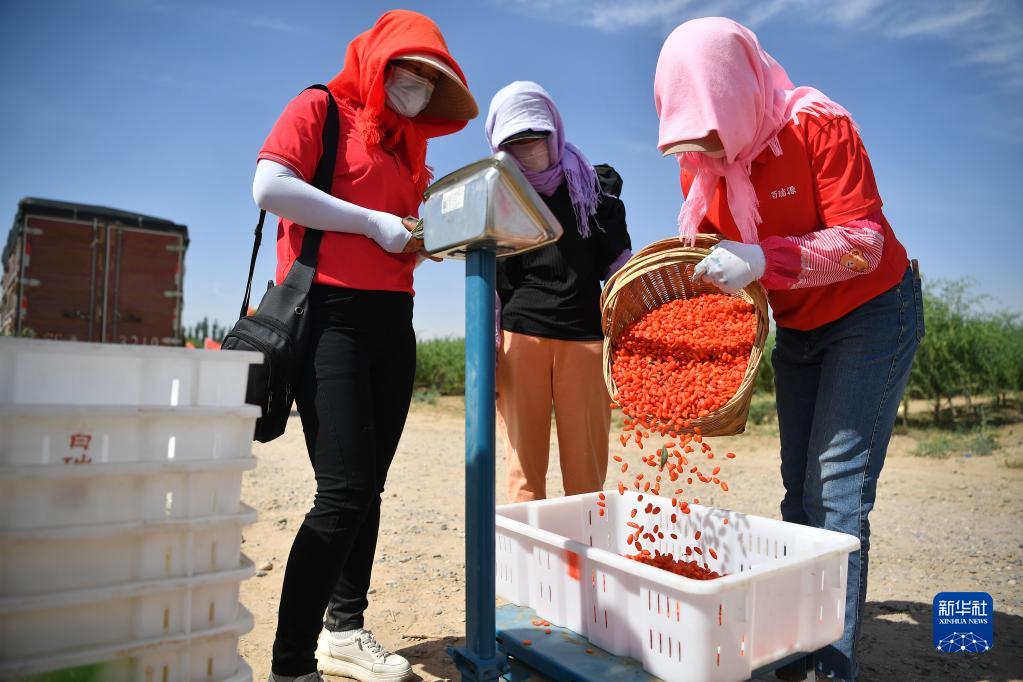 6月15日,在寧夏吳忠市紅寺堡區百瑞源枸杞種植基地,采摘工將采摘的鮮枸杞稱重。