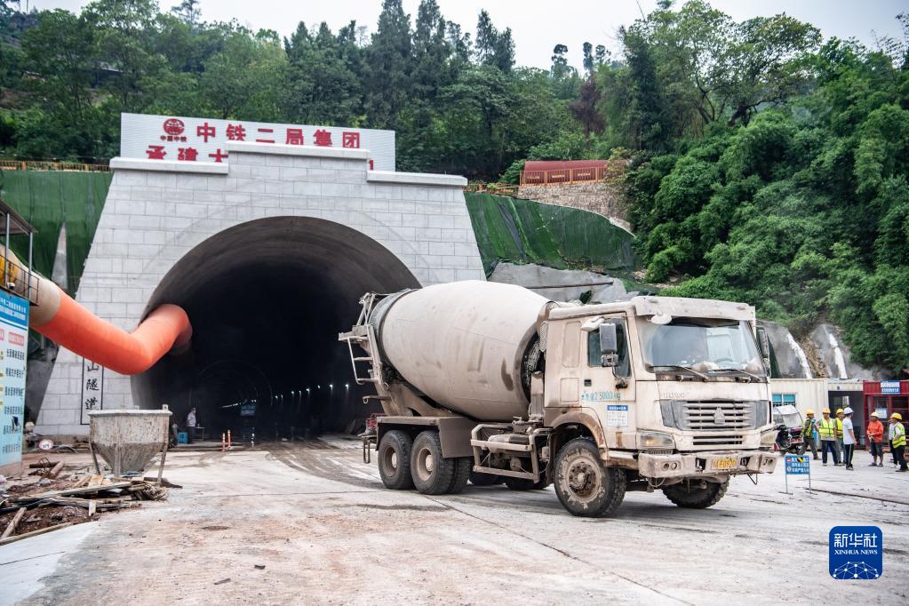 6月15日,工程車輛在渝昆高鐵川渝段大山隧道建設工地上行駛。