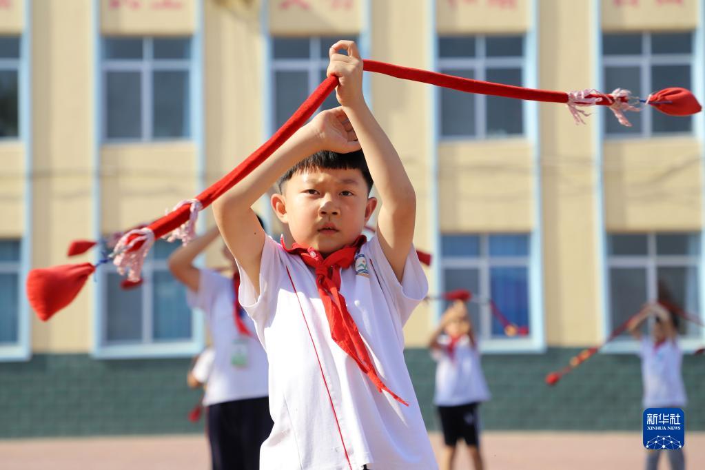 6月15日,在河北省滄州市吳橋縣運河小學,學生練習傳統雜技水流星。