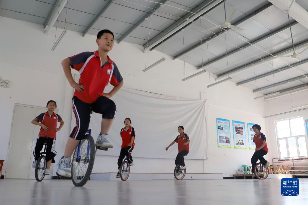 6月15日,在河北省滄州市吳橋縣馬庫吏小學,學生練習雜技獨輪車。