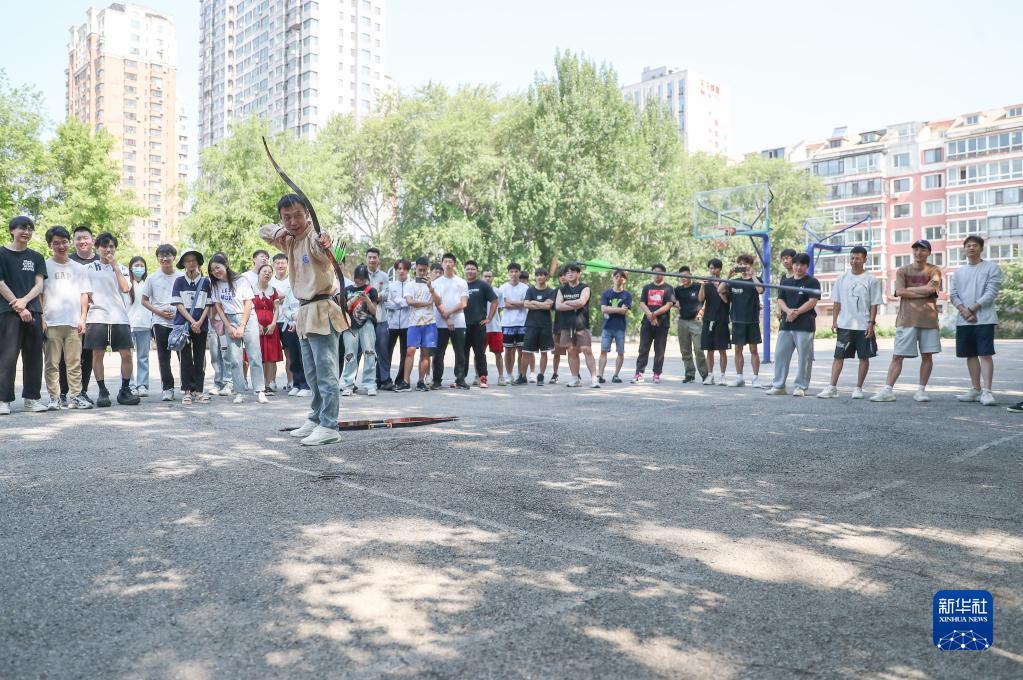6月15日,沈陽市非物質文化遺產項目——錫伯族弓箭傳統制作技藝的傳承人鄂建燁在沈陽師范大學為學生示范傳統弓箭射箭動作。
