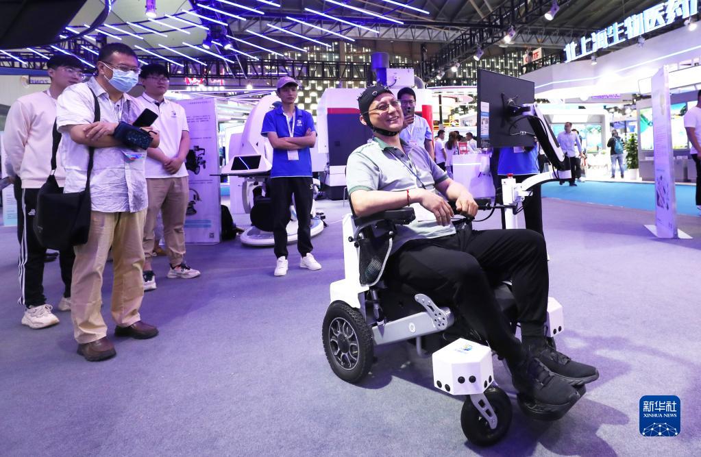 6月15日,參觀者在展會現場體驗一款腦控代步車。