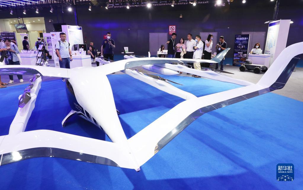 6月15日,參觀者在一款電動垂直起降固定翼載人機前交流討論。