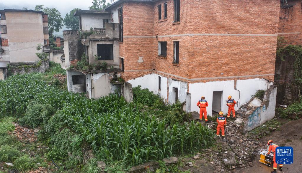 6月15日,六盤水市消防救援支隊隊員在救援演練中進行破拆(無人機照片)。