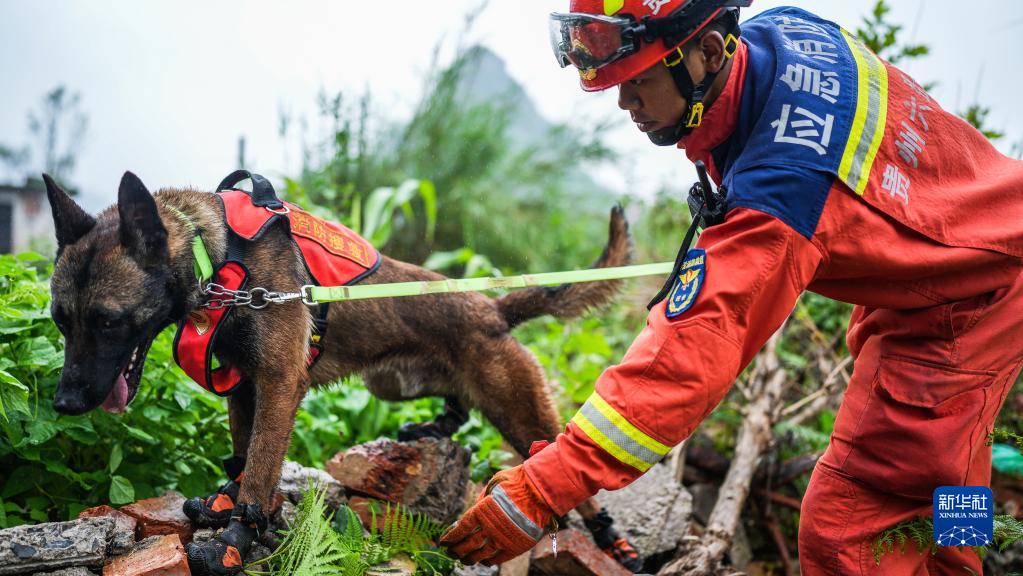 6月15日,六盤水市消防救援支隊隊員在指揮搜救犬進行搜索。