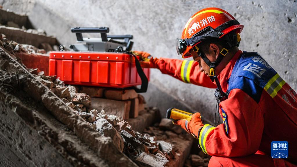 6月15日,六盤水市消防救援支隊隊員在使用生命探測儀進行探測。