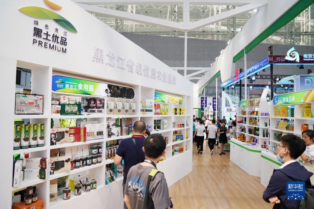 6月15日,在黑龍江一農產品品牌展區,參會者在了解展品情況。