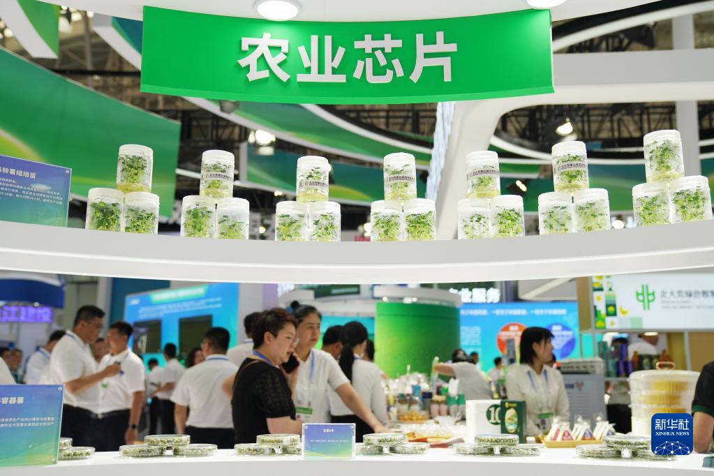 6月15日,在北大荒集團展區,參會者在了解展品情況。