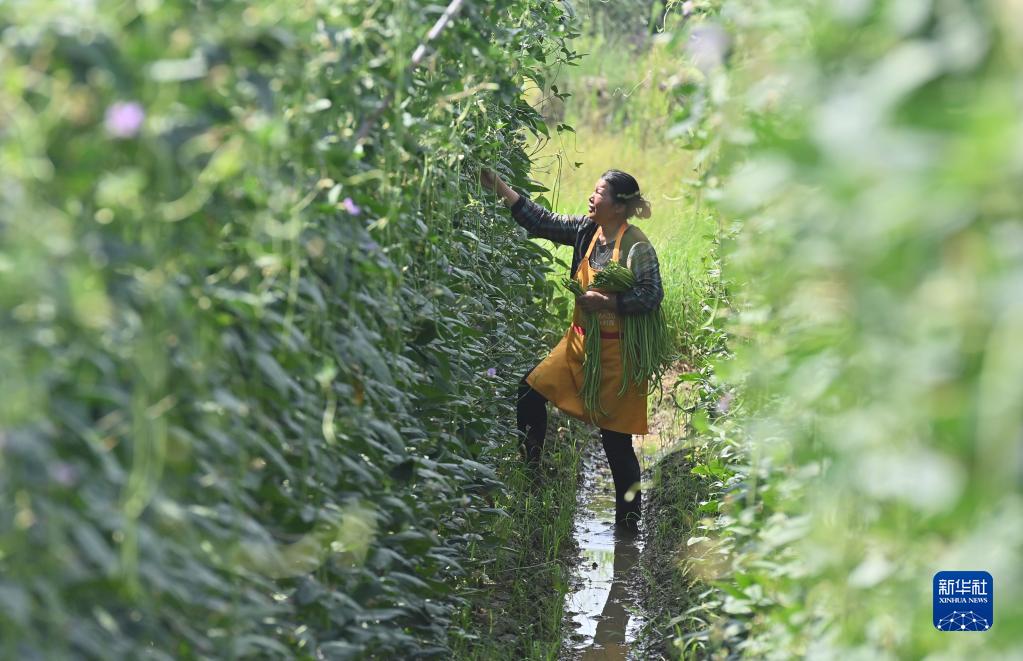 6月15日,在鹿寨縣中渡鎮石墨村,村民在高標準農田里采收豆角。