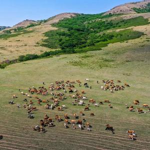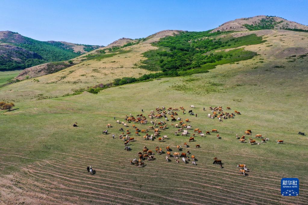 夏日,內蒙古阿魯科爾沁草原綠意盎然,牛羊在草原上覓食,景色如畫。