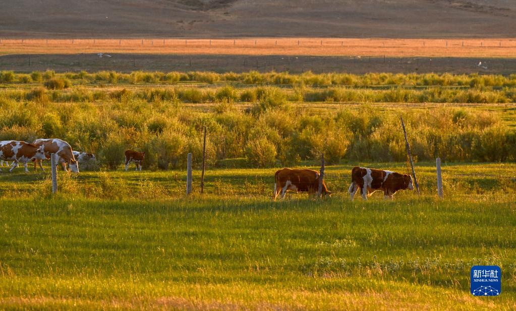 夏日,內蒙古阿魯科爾沁草原綠意盎然,牛羊在草原上覓食,景色如畫。