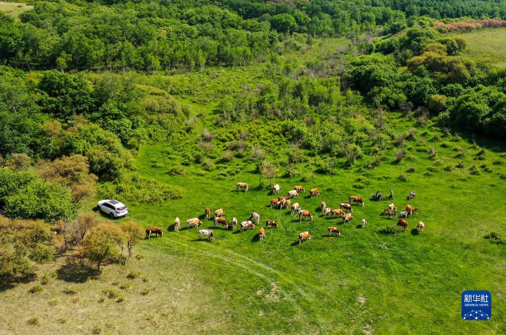 夏日,內蒙古阿魯科爾沁草原綠意盎然,牛羊在草原上覓食,景色如畫。