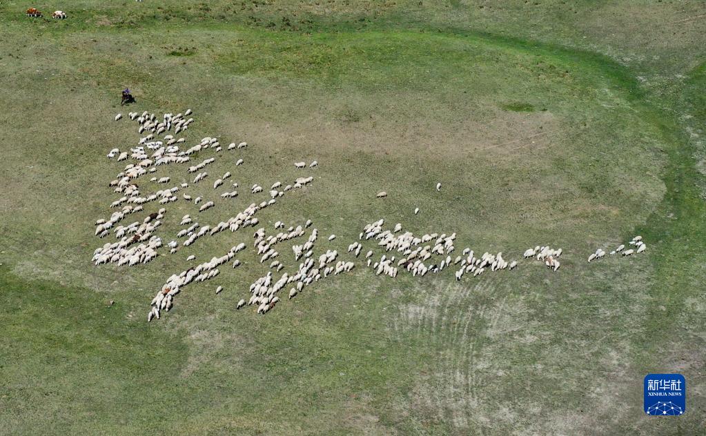 夏日,內蒙古阿魯科爾沁草原綠意盎然,牛羊在草原上覓食,景色如畫。